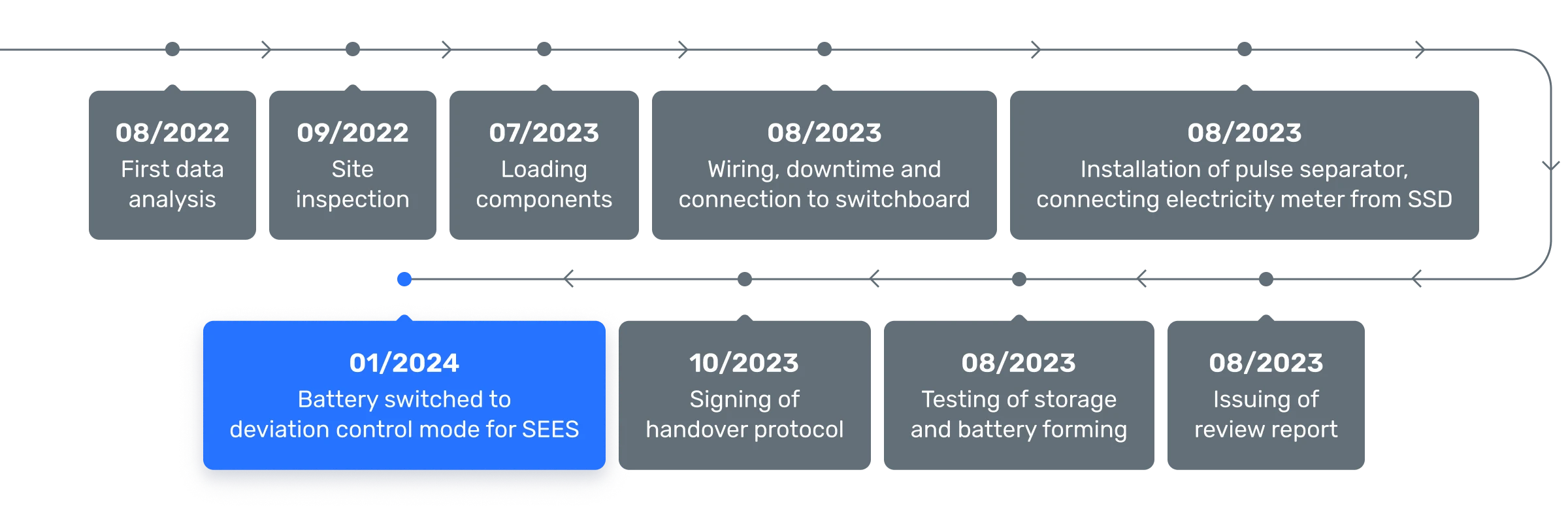 After changing their energy supplier, the storage facility could also begin to fulfill its primary role – to regulate the consumption of electricity at the delivery point in order to generate a financial profit from the provision of non-certified ancillary services. This reduces the overall energy costs and carbon footprint of the delivery point.