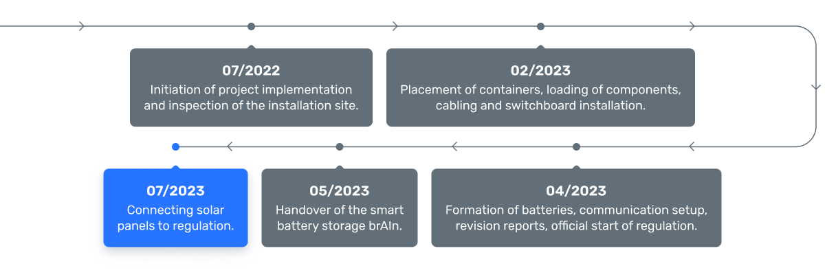 During the initial energy audit, we studied a 15-minute electricity consumption diagrams of the delivery point from the last two years. According to this data, the supplier suggested an ideal capacity for the local energy source – solar panels with an installed capacity of 970 kWp. Once we knew the consumption profile and the planned capacity of the green source, we designed an optimal battery storage capacity of 864 kWh. When designing the storage capacity, we also checked whether the company meets the conditions for battery rental under the Smart battery storage brAIn as a Service model.