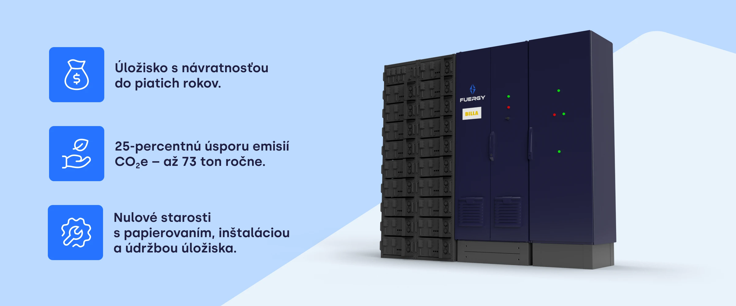 Vďaka batériovému úložisku, ktoré bezemisne nahrádza fosílne zdroje, poskytujúce podporné služby elektrickej sieti, si môže BILLA medziročne vylepšiť svoje ESG skóre o takmer 73 ton emisií CO2e. Táto úspora predstavuje zníženie celkových uhlíkových emisií zo spotreby elektrickej energie príslušnej prevádzky o približne 25 %.