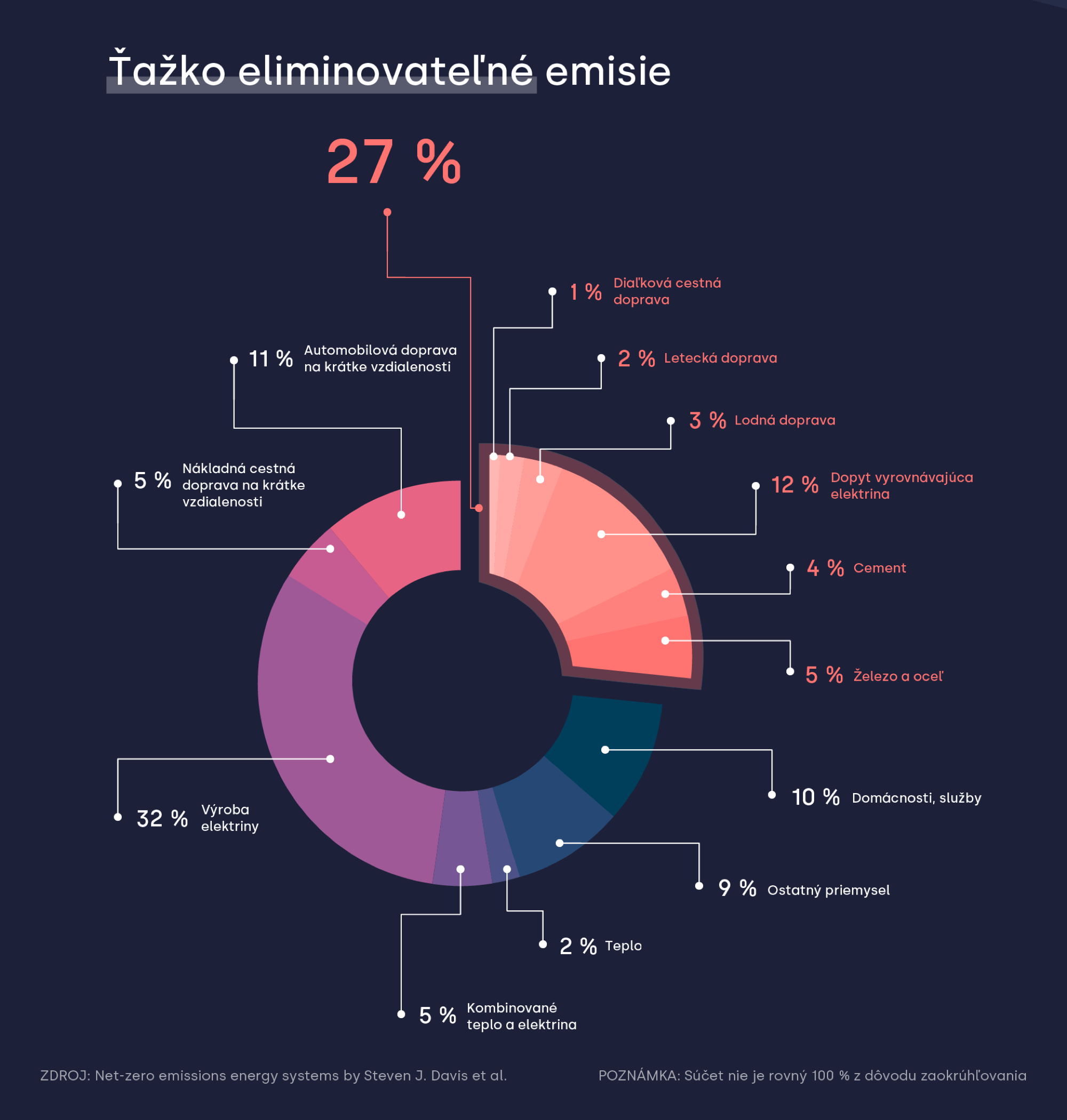 Ešte v roku 2018 vyšla podrobná správa, ktorá tieto sektory pomenovala a vyčíslila ich podiel na celkových emisiách. Na grafe tak môžeme vidieť, že až viac ako štvrtina všetkých emisií patrí do kategórie ťažko eliminovateľných. Hoci dnes už máme technológie, ktoré dokážu tento problém riešiť, často im chýba dostatočná zrelosť. Tento fakt sa prejavuje najmä ich vysokými cenami. V mnohých krajinách najviac absentuje aj politická vôľa s emisiami výraznejšie bojovať.